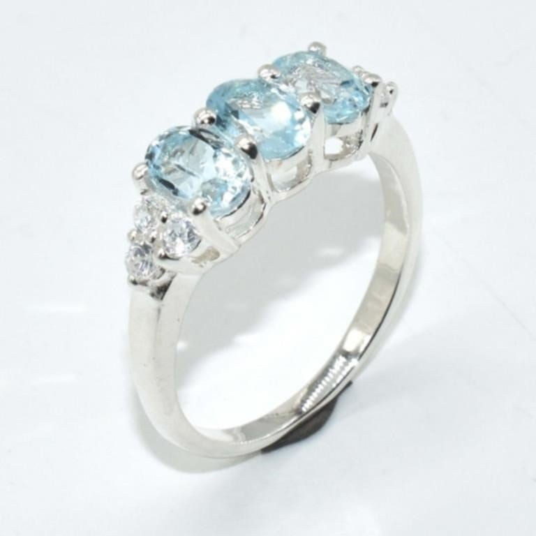A collection of elegant silver rings with various gemstone designs, including dark gemstone flower design, purple gemstone with clear accents, and four blue gemstones.